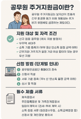 공무원 주거지원금은 공직자의 생활 안정과 근무 효율성을 높이기 위해 마련된 주거비 보조 제도입니다.