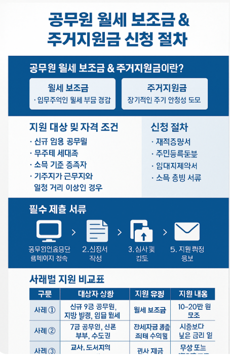 공무원에게 제공되는 월세 보조금과 주거지원금은 신규 임용자, 무주택자, 지방 발령자에게 실질적인 도움이 되는 제도입니다. 하지만 모든 공무원이 자동으로 받을 수 있는 것은 아니며, 자격 조건과 신청 절차를 충족해야 합니다. 이번 글에서는 공무원 월세 보조금과 주거지원금이 무엇인지, 신청 조건과 단계별 절차, 필요한 서류, 유의사항까지 알기 쉽게 정리했습니다.